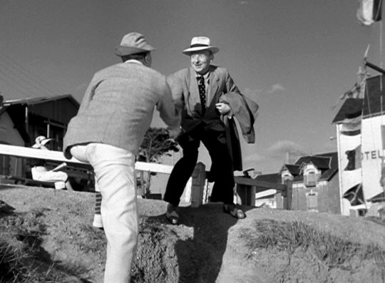 Both of these characters are, in some way, outsiders, either by being culturally different (the Englishwoman) or by being a henpecked observer (the Strolling Man). And, of course, Hulot is an outsider in so many ways. I believe that Jacques Tati sees Hulot as a kind of tonic, or a moment of trueness, for those who have hearts capable of responding.