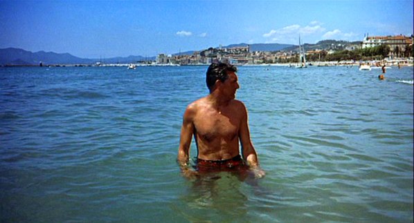 This image also conveys less of the glamorous beauty one first gets of her in Rear Window and instead shows her as both sexy and mysterious. Her mysteriousness hides her, make her more impenetrable, and places her in the same visual context as some of the other characters from John Robie’s (Cary Grant) criminal past. In other words, we are not entirely sure who she is, maybe she is Grace Kelly but those glasses, etc., make it hard to know. Maybe she is another of those people who are looking for/searching for John Robie. Who knows. Her sexiness is also a kind of self-absorbed narcissism, played out more so later in the film, but here shown via her sun-worshiping attitude. She is not the soft, gentle, open, warm, beautiful Grace Kelly we saw in Rear Window. She is a distant, protected, maybe a little critical, and “boy” watching Grace Kelly here.