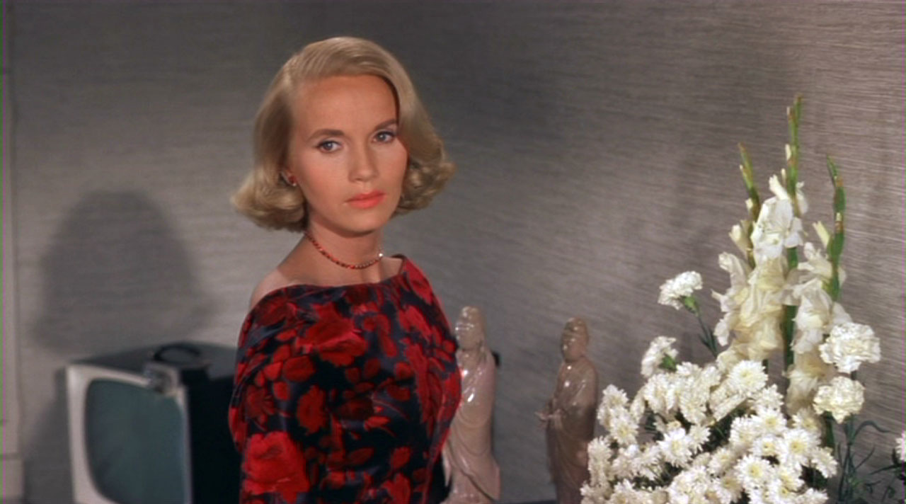 It is so quintessential late 1950s, and it is beautiful while being ordinary. Having been on film and television sets, I know that even such a simple shot as this took a while to make as each little detail was put in its place, as Eva Marie Saint was told exactly where and how to stand, and how to turn toward the camera. This shot is common – especially then – for female leads, with her torso facing to one side of the camera and her gaze going in the other direction.