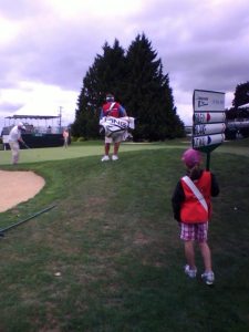 Today was the first day of The Oregon Classic golf tournament. My daughter, Lily, is a member of The First Tee, and the kids were asked if they wanted to be volunteers at the tournament. She held the sign that displayed the player’s scores. We were with Arjun Atwal, Chris Riley, and Jay Don Blake.