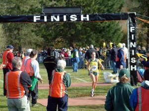 Here is Teresa McWalters of Stanford crossing the finish line in first place with a time for 6K (3.7 miles) of 19:57.30, or an average of 05:21.14 per mile.