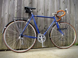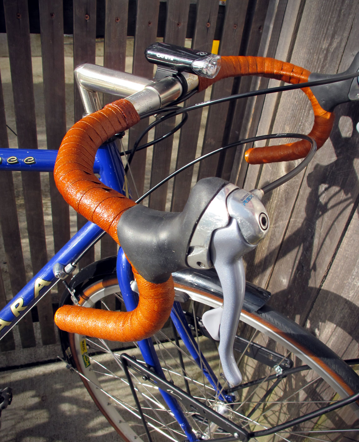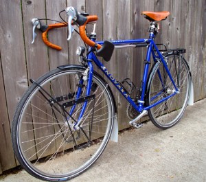 I am finally nearing “completion” on my Novara Randonee. Novara is an REI brand, which basically means the bike is mass produced in one of those factories that pump out bikes for just about everyone. So it’s not that expensive or particularly desirable, but it is good, and just right for me. I purchased the bike in 1995, that’s sixteen years ago! Time flies. The Randonee model is designed for touring. I bought it for commuting with the hopes that I would do some touring with it eventually, which I have not yet done. I wrote about taping the handlebars a while ago. Now I finally have the Brooks saddle in place, plus a few other improvements.