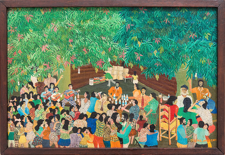 “Mango tree in front of the church,” by Oscar Mairena, 1975, Oil on canvas. Ernesto Cardenal is depicted in his typical black beret and white shirt on the right leading a discussion. (source)