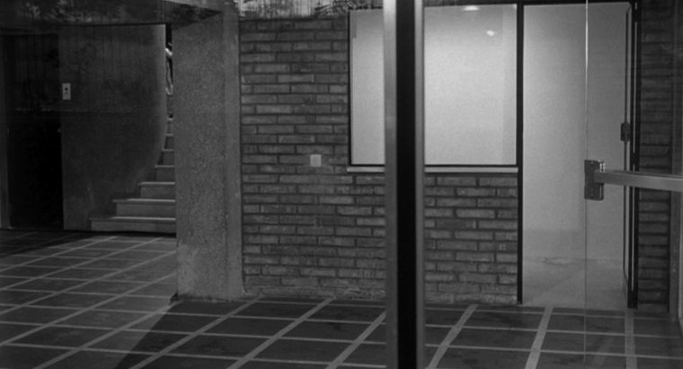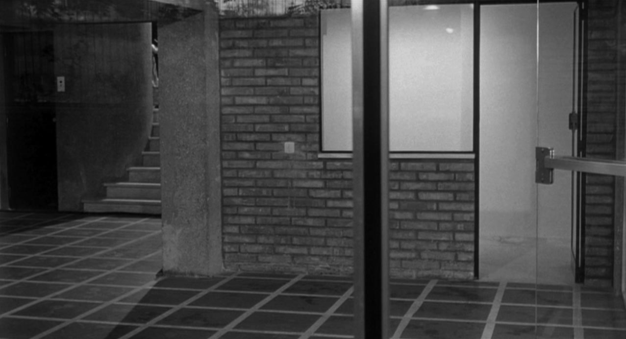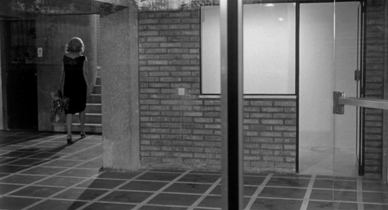 Here she watches her ex-lover walk away as she stands at the entrance of her apartment building. She is visually framed by elements of that building which seems to dominate the scene. There is a kind of hopeless emptiness in her eyes and posture. She does not yet know that it was not that she was trapped in an empty relationship from which she is now free, rather she is still trapped in herself in the modern world. Antonioni uses modern architecture to symbolize the prison of modern society.