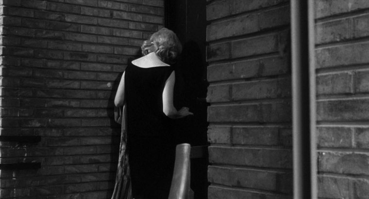 As she enters her apartment the camera is placed outside her windows in such a way as to emphasize that she is inside the building. And again, the architecture dominates, framing her “within” its space.
