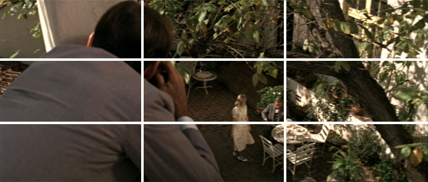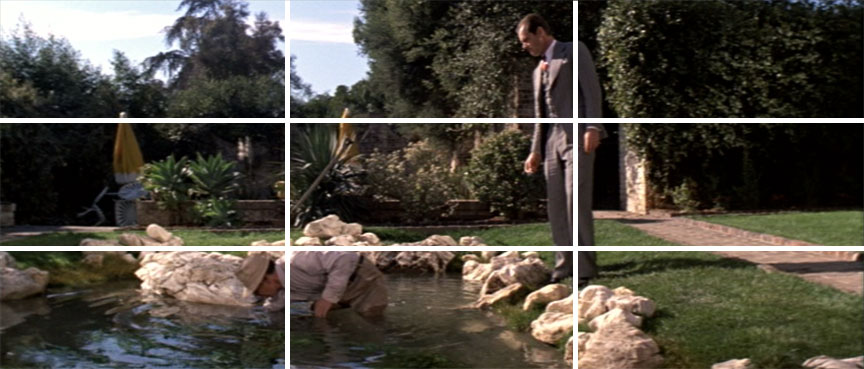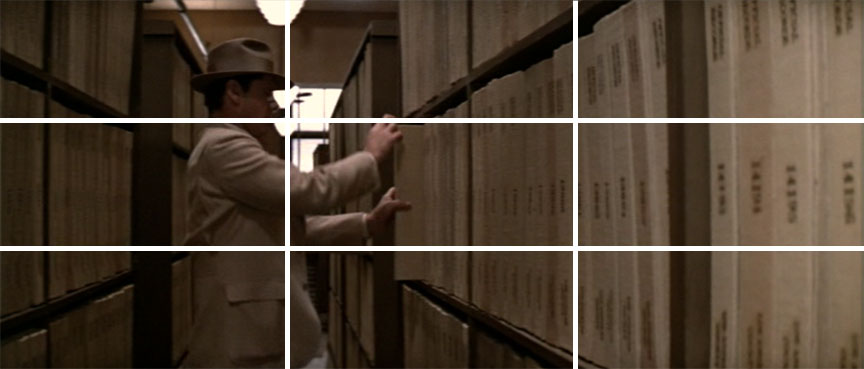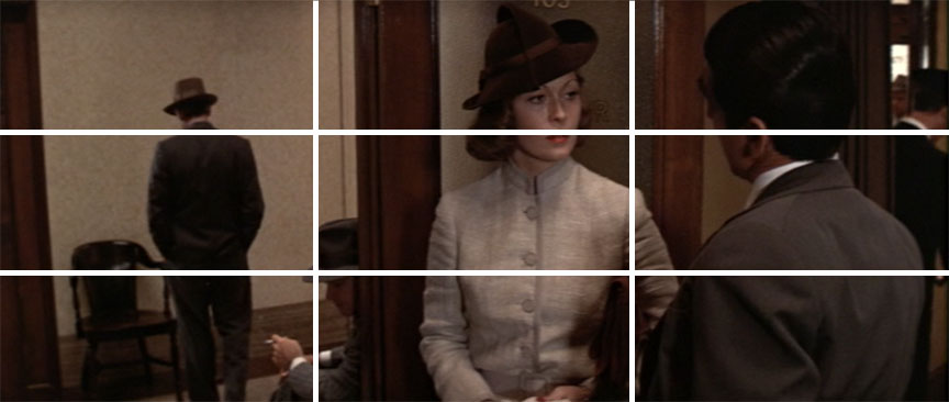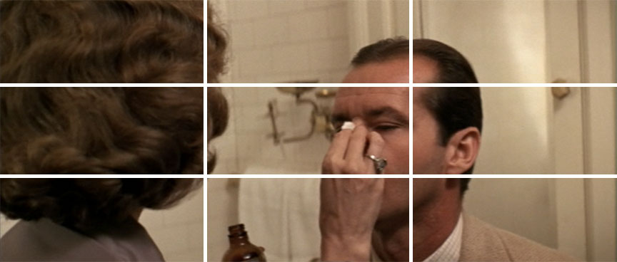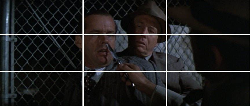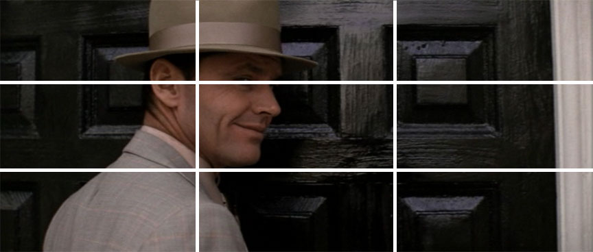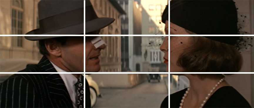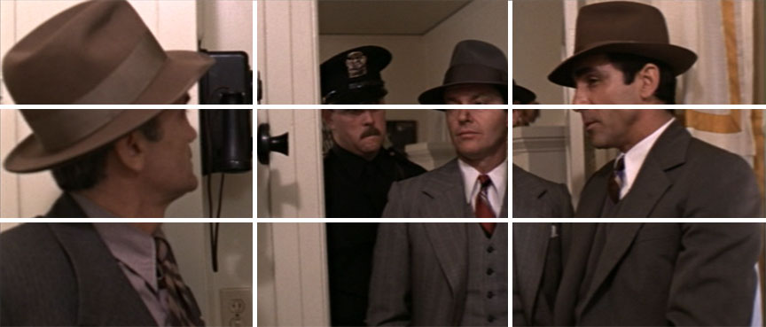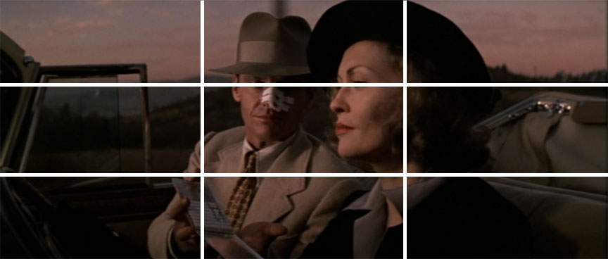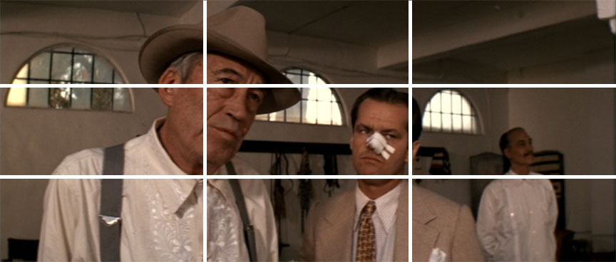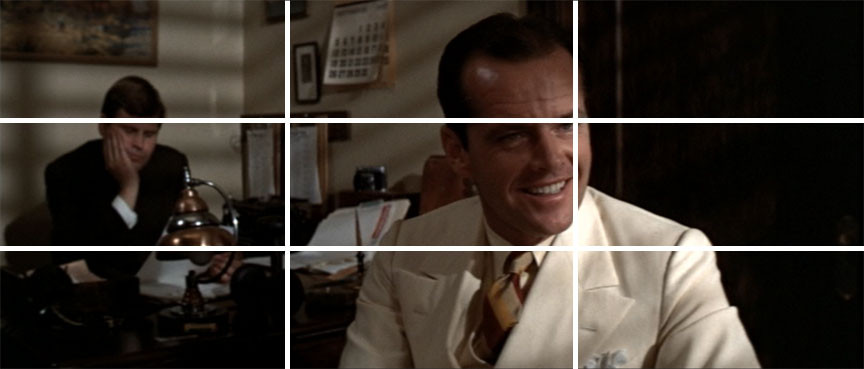 In Chinatown the images are constructed around those lines and intersecting points. By doing this the aspect ratio becomes a relatively mute point as the human brain automatically takes in the whole image, mentally divides the image into thirds, and finds pleasure as key visual elements are constructed around those thirds. Of course, deviation from the power of the thirds creates visual tension, which is an additional tool in the filmmaker’s toolbox.