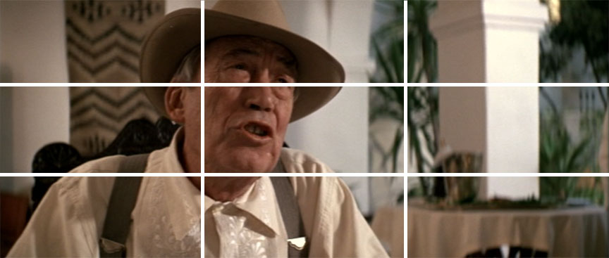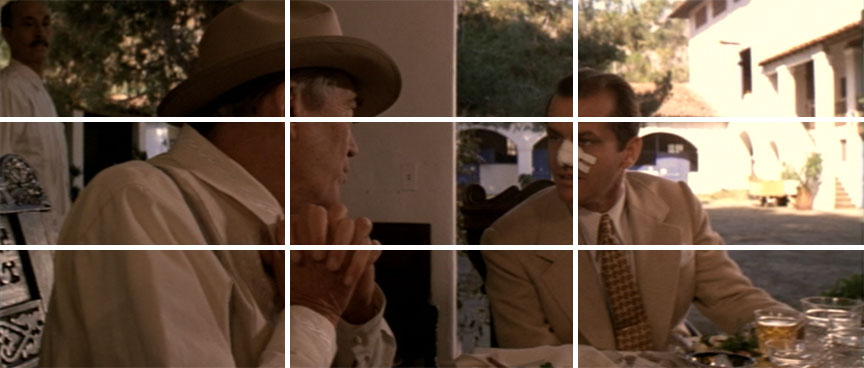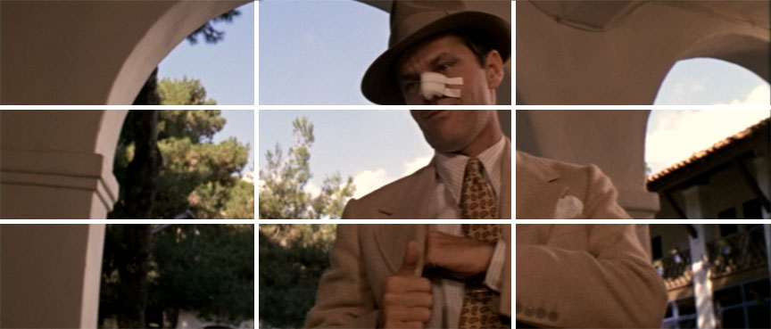 Many films are beautifully shot. Few, though, are as consistently well composed as Chinatown (1974)*. Shot in Panavision (anamorphic) format with a 2.35:1 aspect ratio the somewhat extreme rectangular image would seem to offer significant challenges to effective image composition. As I was pondering this challenge I was struck by how much I loved the images in Chinatown, which I just watched again the other day. That’s when I went back to basics and considered that even with widescreen images there are still fundamentals of composition at play. In this case I figured I would grab a few images (one from each major scene) from the film and apply the Rule of Thirds to each image.