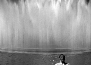 This shot comes during the big song and dance number at the Blue Venetian Waters (some kind of cabaret/night club). The singers are on a boat and the boat moves slowly toward the camera until the singers exit the bottom of the frame. The camera does not follow the singers but stays on the fountain. I don’t know why they chose to do this, but it certainly created a briefly funny visual moment. I don’t think the humor was intentional even though the film is a comedy. Anyway, I laughed.