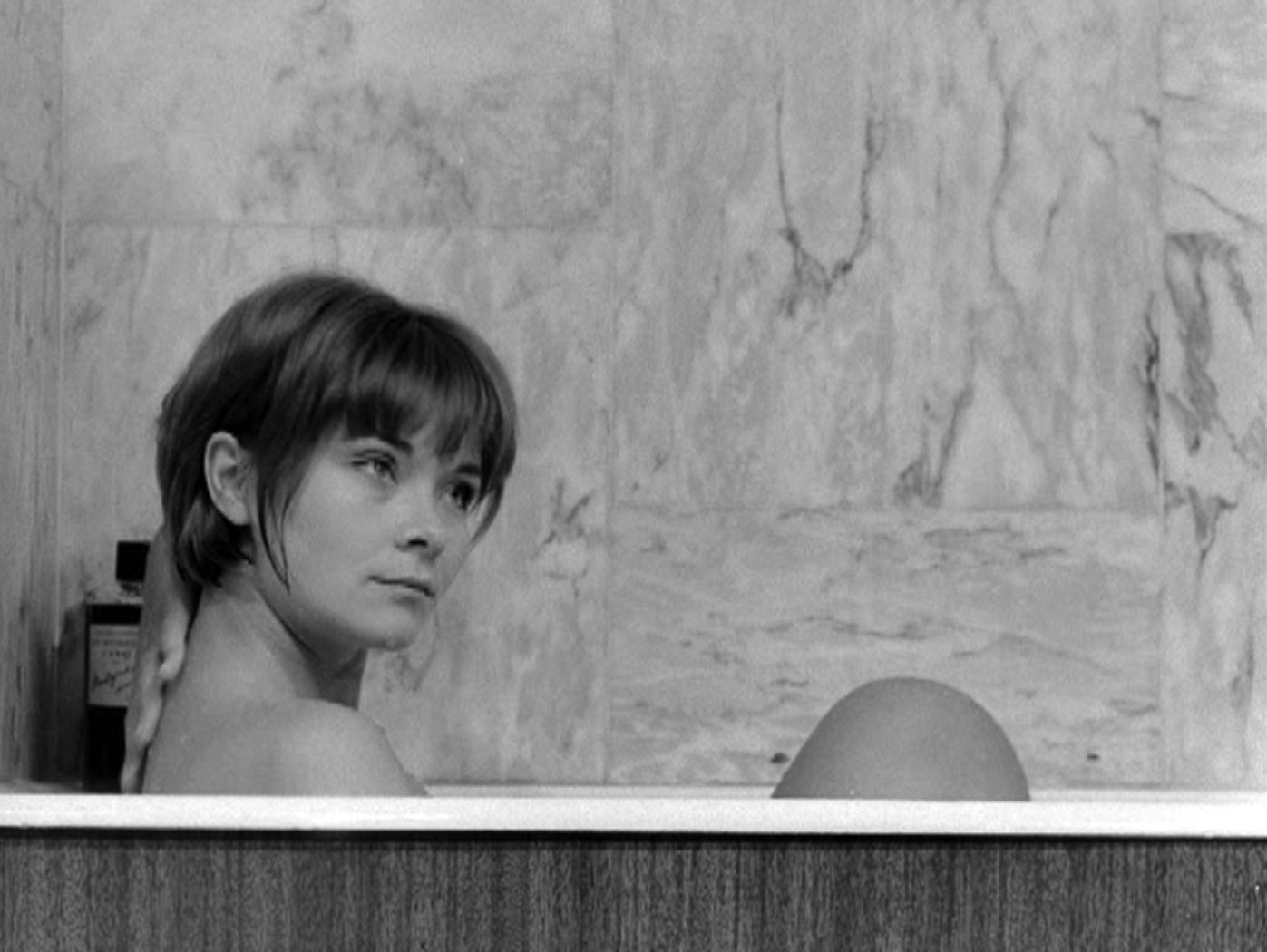 European films of the 1960s gained a reputation in the U.S. for being risqué. Though tame by today’s standards, to have a woman trim her pubic hair, even if only suggested, would have called attention to itself, and Godard makes sure the camera holds long enough for us to notice. Within the context of the film this shot makes a great deal of sense. Her bathing and grooming, and the calling attention to the details of her actions present to us the actions of her spirituality, her disciplines. This is not a world without a god, rather it is a world of many gods (her husband worships airplanes and is a pilot) and her god is a combination of love, sex, her body, her image as woman, etc. In this quiet moment we are voyeurs to her prayer, to her communion.