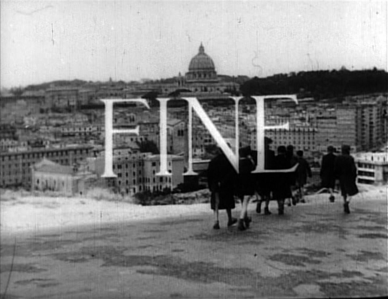 One aspect of Italian neo-realism is its ability to take the ordinary, portray it rather straightforwardly, and yet load it with both connotative and denotative meaning. The ending is a good example. After Don Pietro is murdered by the fascists, his students, who watched his killing, walk together back to the city. In the middle ground are modern apartment buildings. In the distance is the dome of St. Peter’s (I believe).