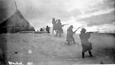 The young woman has been caught by the carabiniers and is put in front of the ad hoc firing squad. She has already had a chance to espouse some Marxist philosophy only to make the commander upset. The men raise their rifles and get ready to shoot.