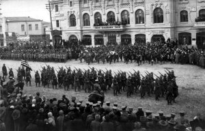 The men have trouble with her simple pleas. Several times their guns waver. Something inside them responds to the reality that they are all brothers in a bigger struggle. The handkerchief is then taken off her head and she recites a parable from Mayakovsky. But finally, they shoot and she is dies. But she doesn’t die quick enough, so as she lies on the ground a soldiers says she is still moving…
